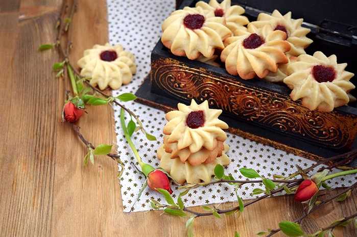 Qurabiyələrin ortasında oyuqlar açılır və 250 dərəcəli sobada 10 dəqiqə bişirilir.