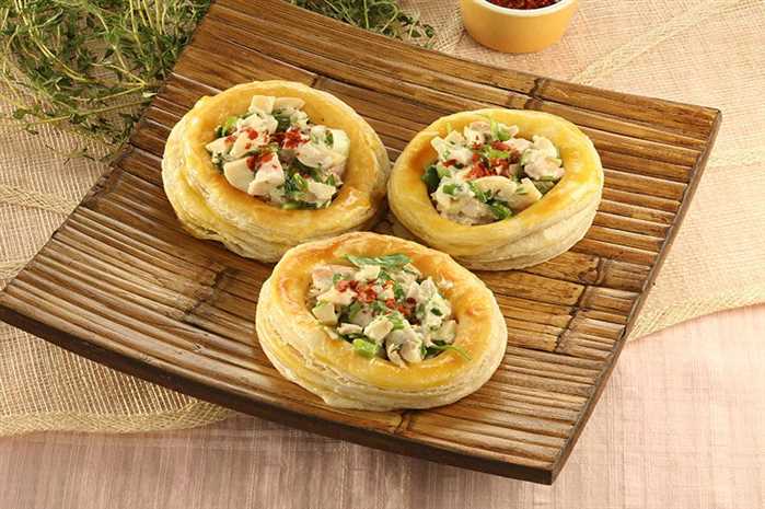 Milföy xəmirinin üçündən bərabər olmaqla 3 yumru dairə yayılır. 2 ədəd də kiçik xəmir yayılır, ortadan kəsilir və kənar hissə əldə edilir.