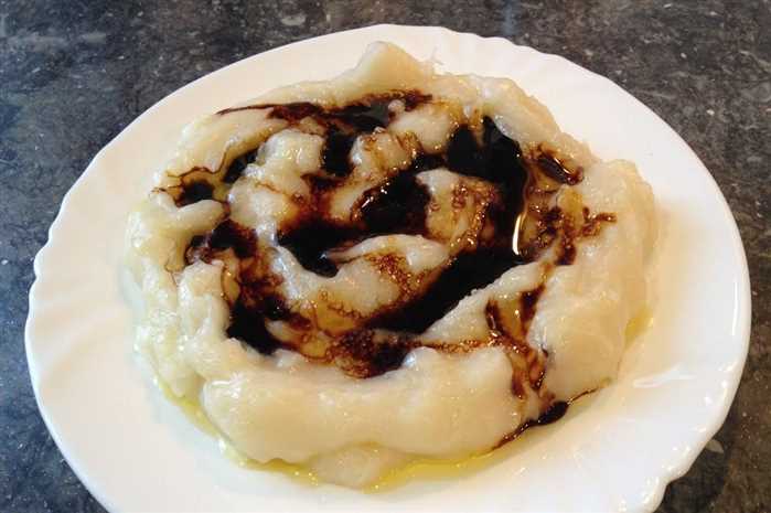 Xama qatılığında olanda boşqablara tökülür. Ortasından qaşıqla çökəklik açılır.